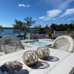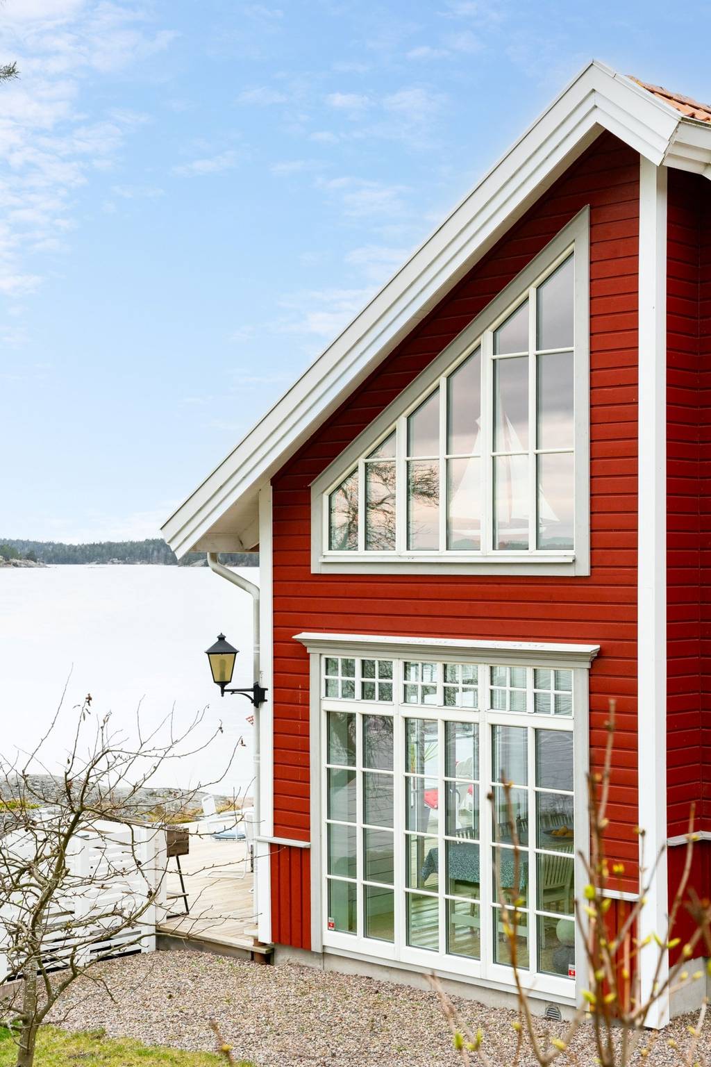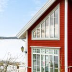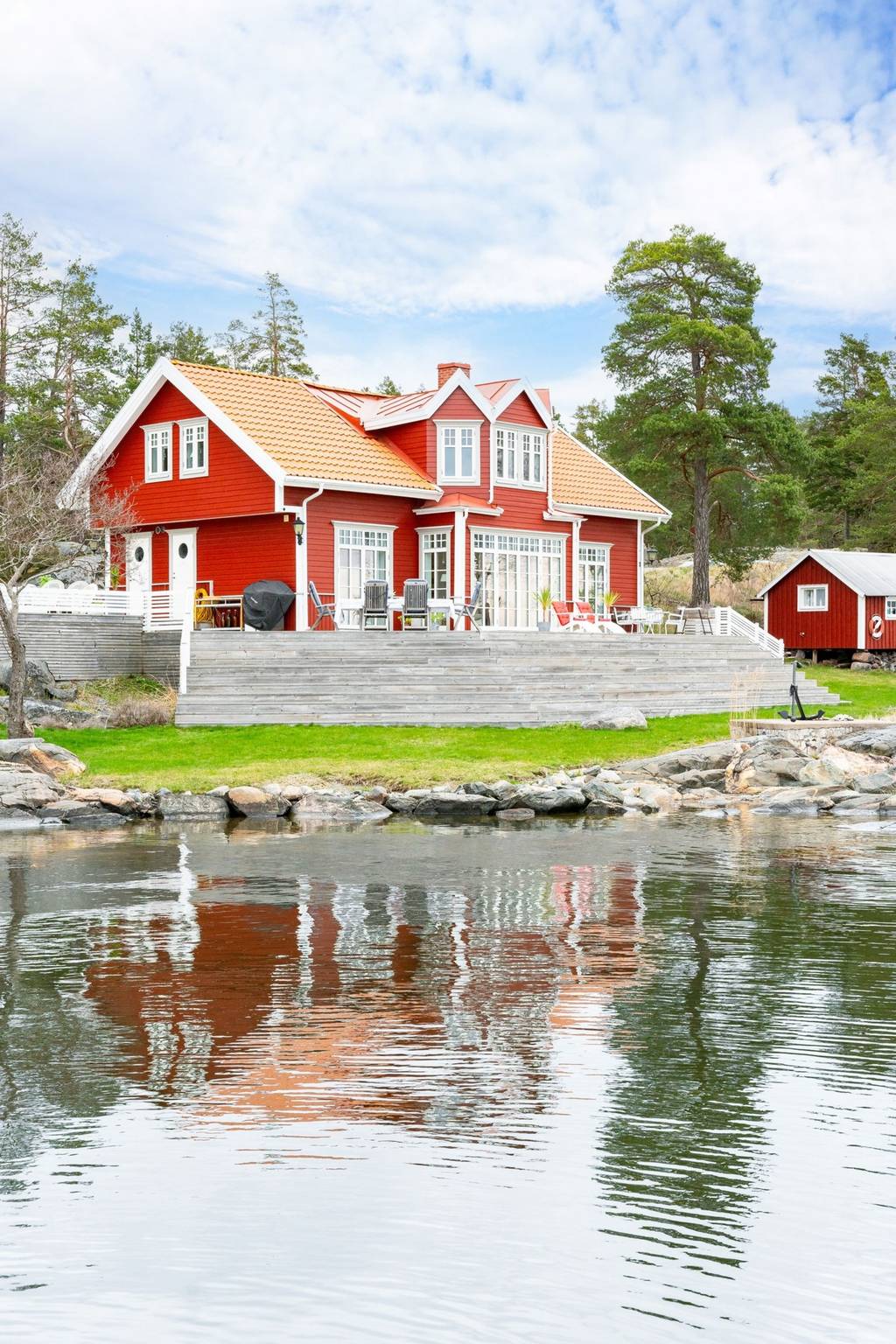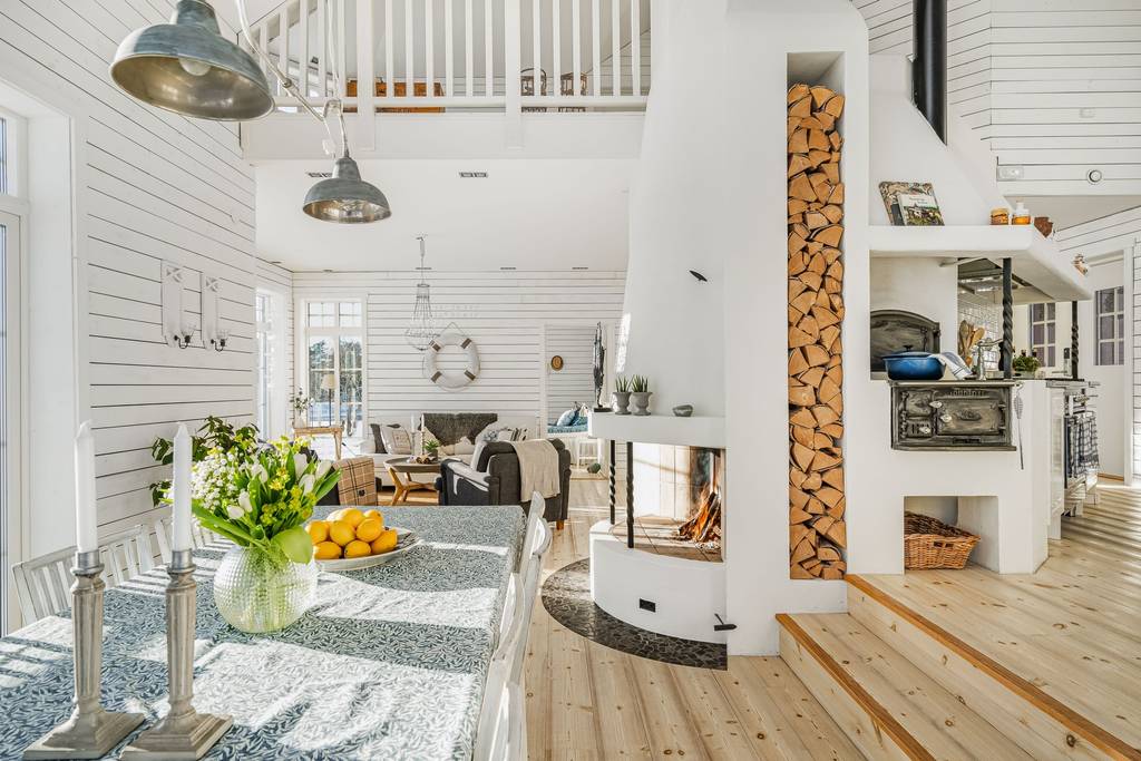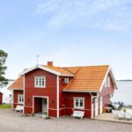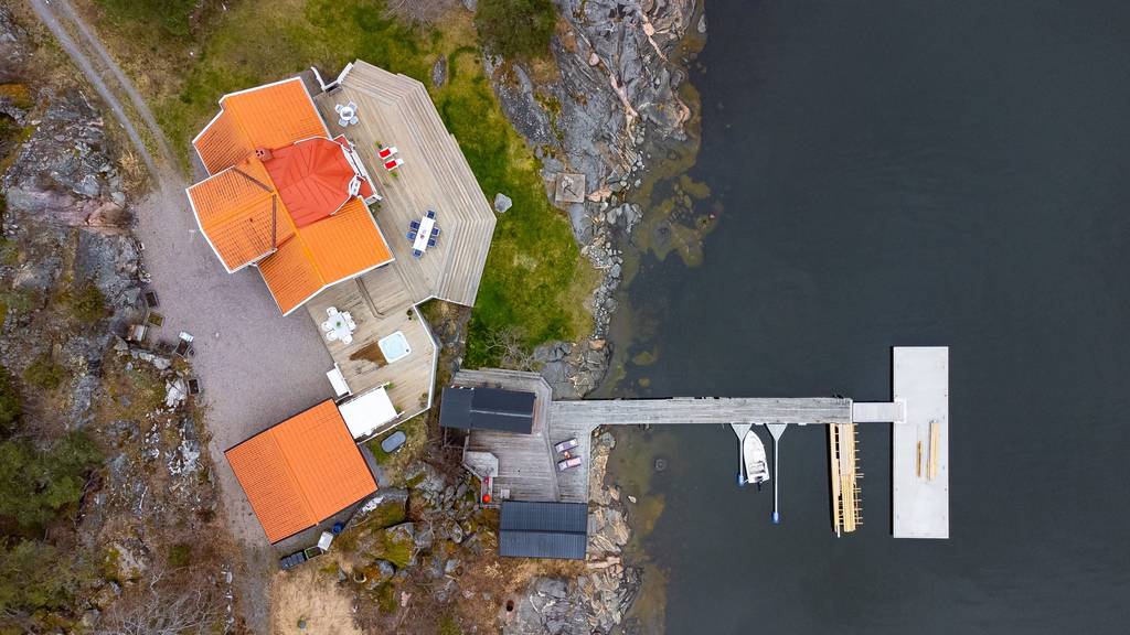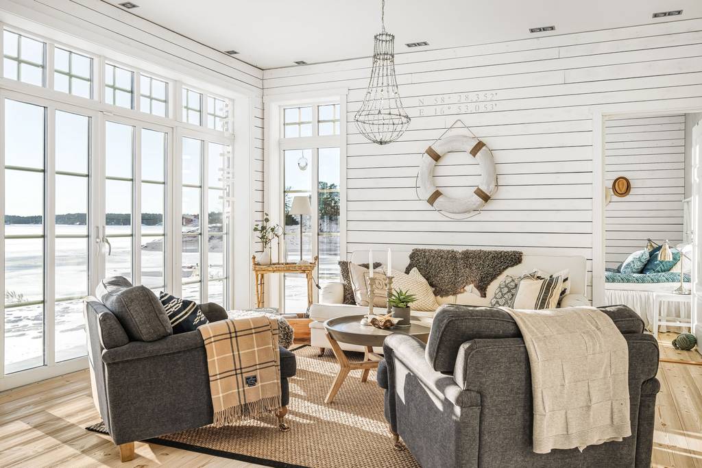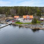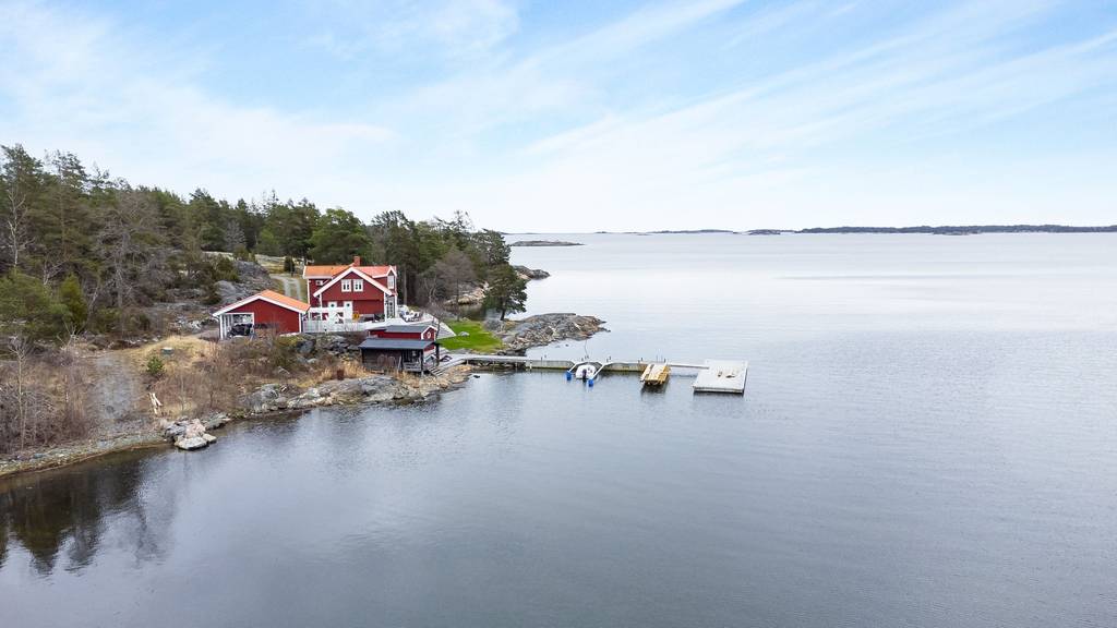 Südliches Schweden, Raum Norrköping – Das schöne Haus mit Holzböden, offenem Kamin, bodentiefen Fenstern, zum First offener Decke und großer Terrasse sowie 2 Gästehäusern, Garage und einem großem Steg mit Bootsanlegeplätzen, liegt ganz alleine gelegen am Wasser in malerischer Natur. Hier sind das Meer und der üppige Mischwald die einzigen Nachbarn, denn das nächste Haus findet man erst in gut 500 m Entfernung.
