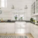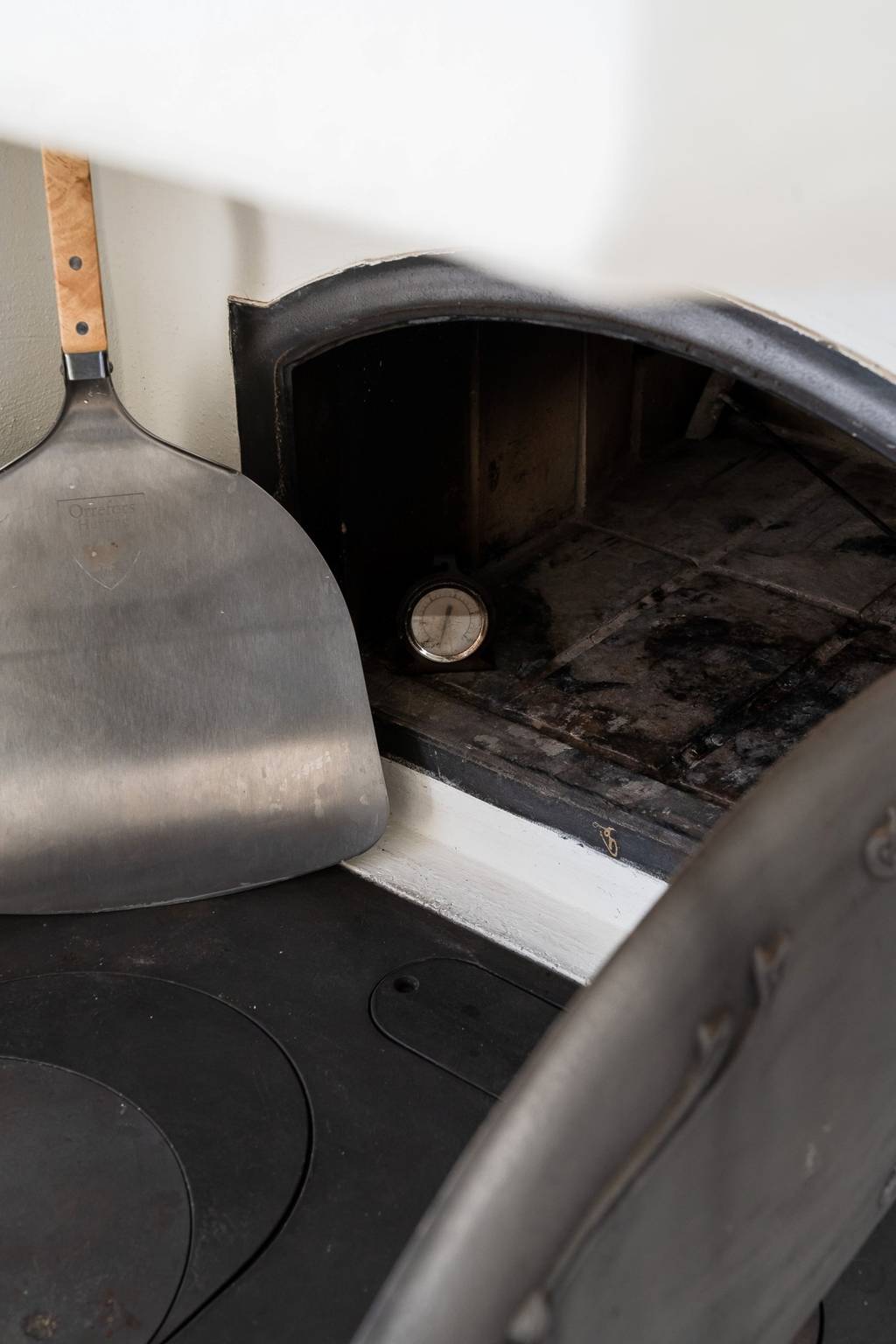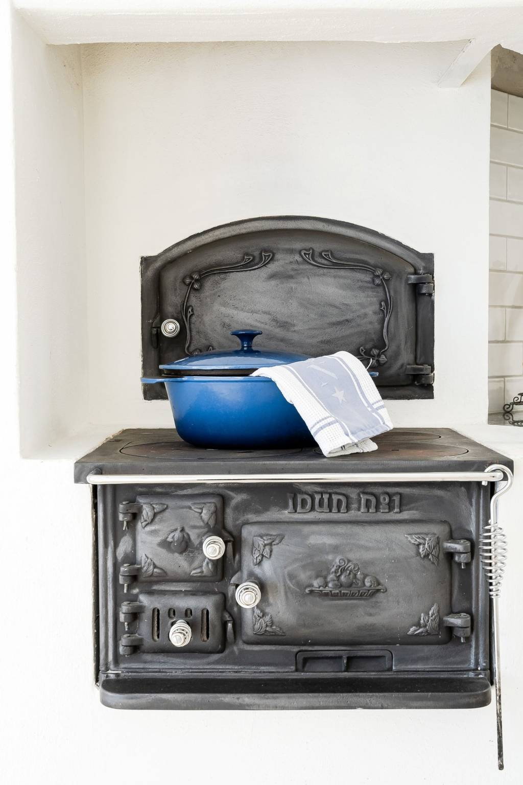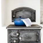 Küche mit Holzboden, zum First offener Decke und Speisekammer, offen zum Esszimmer, (EBK) mit Gasherd/Ofen, Abzugshaube, altem Holzherd, Geschirrspüler, Kühl-&Gefrierschrank.