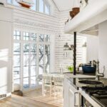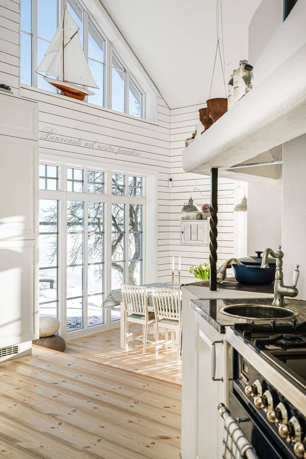 Esszimmer mit Holzboden, bodentiefen Fenstern und zum First offener Decke, offen zum Wohnzimmer.