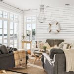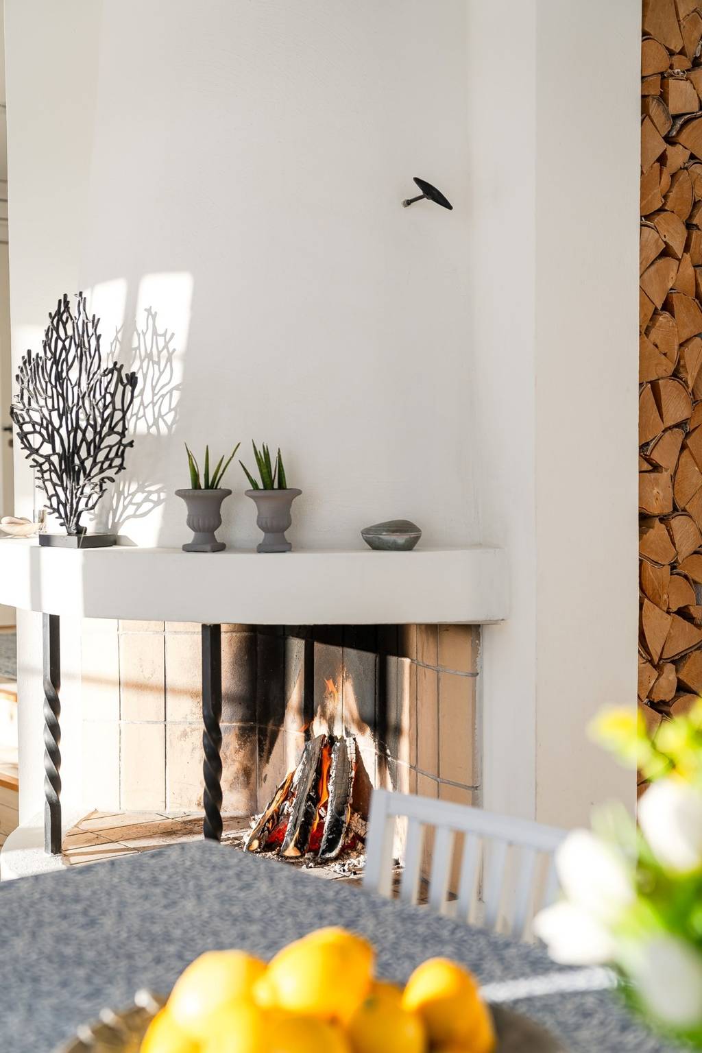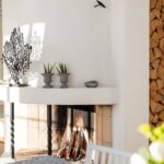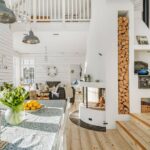 Wohnzimmer mit Holzboden, offenem Kamin und bodentiefen Fenstern