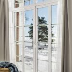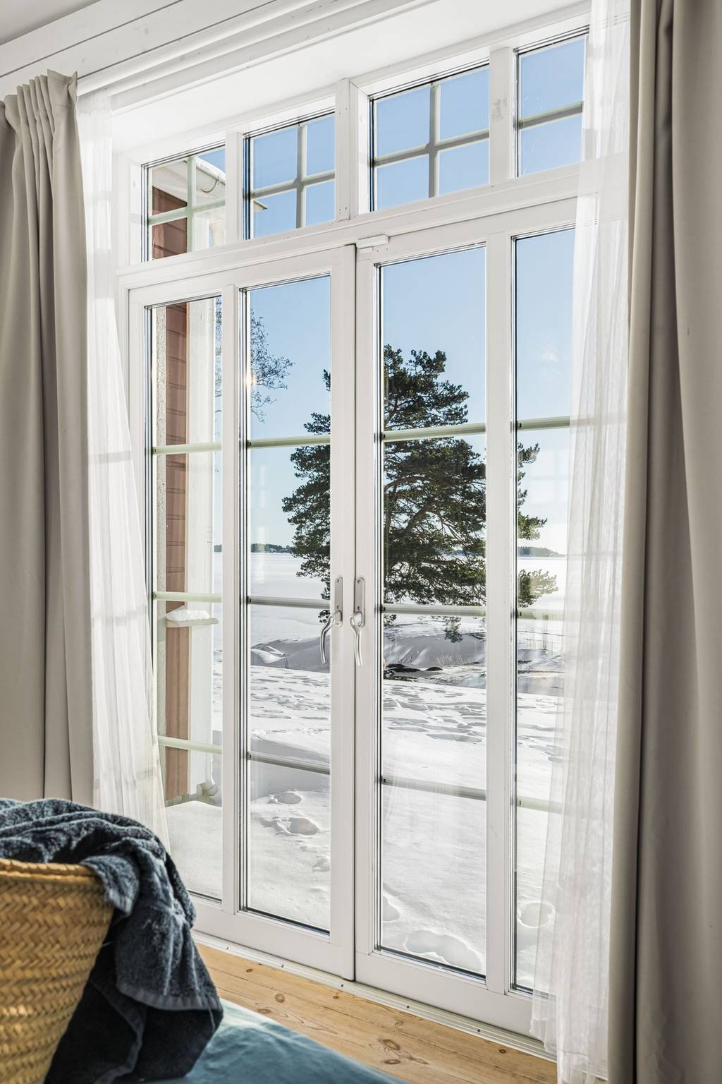 Schlafzimmer mit Holzboden und bodentiefen Fenstern