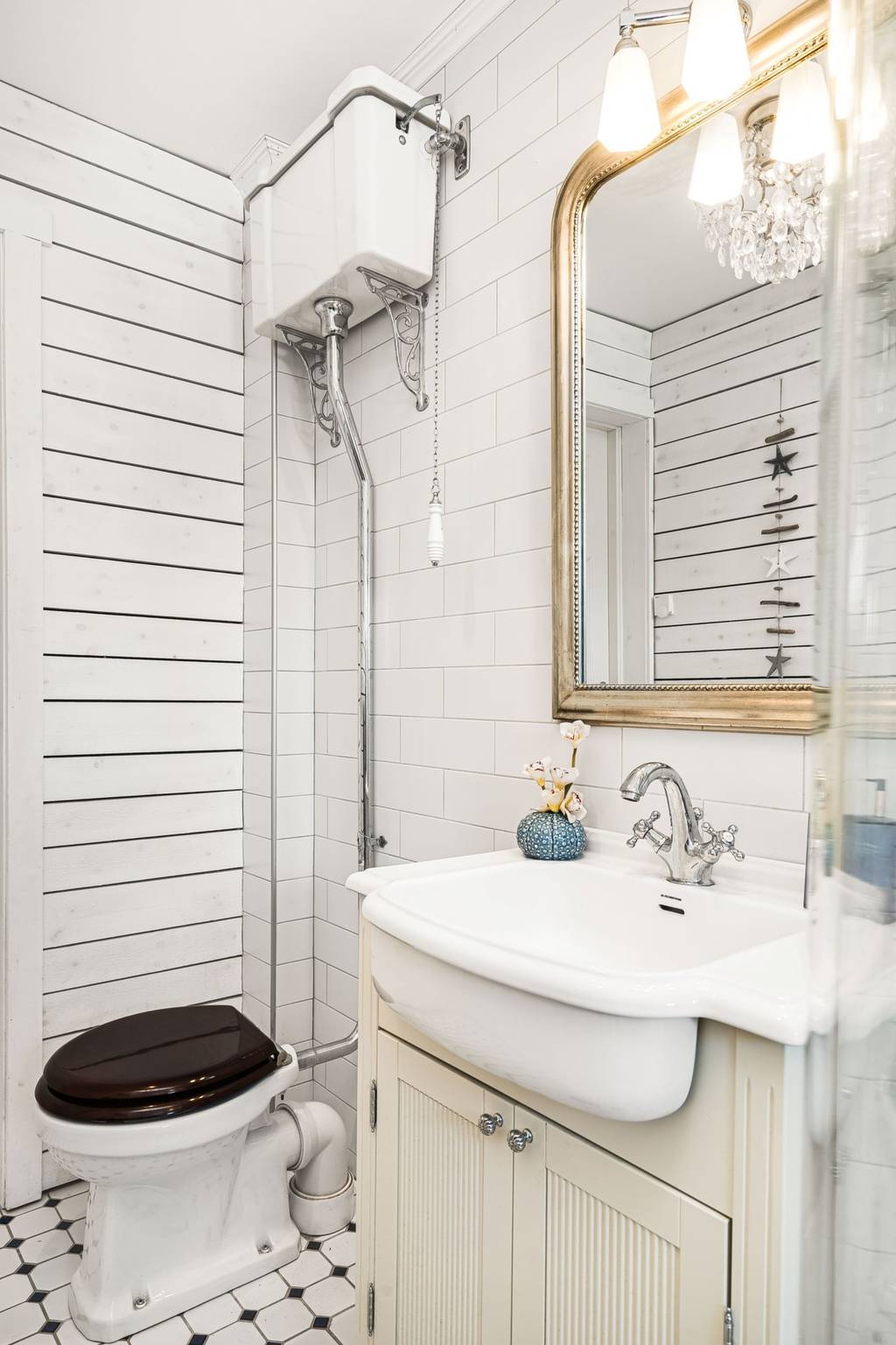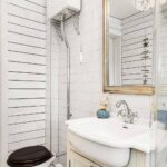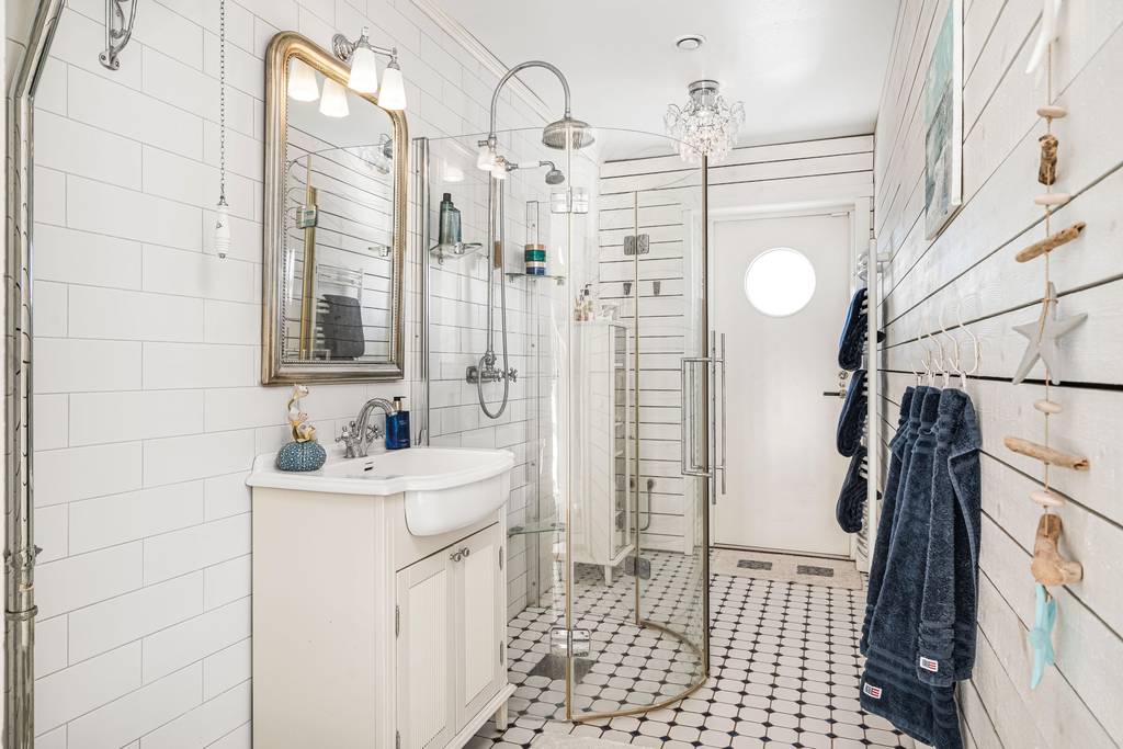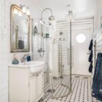 Gefliestes Bad mit WC, Waschbecken und Dusche